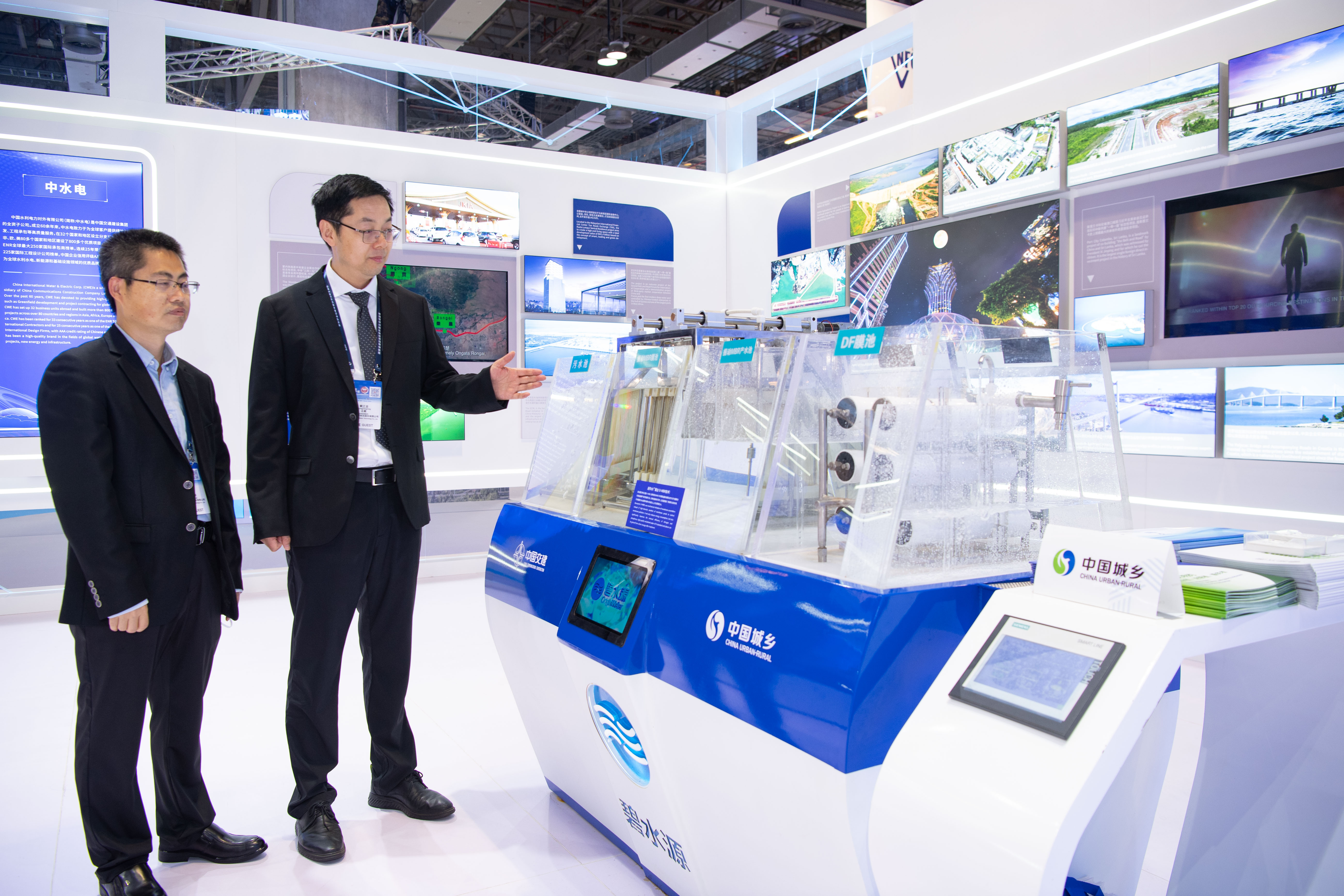 在中國(guó)城鄉(xiāng)控股集團(tuán)有限公司的展位,來(lái)自肯尼亞的客商認(rèn)真觀看應(yīng)用了新型低碳振動(dòng)膜技術(shù)的污水資源化產(chǎn)品演示,并不時(shí)向工作人員咨詢細(xì)節(jié)。